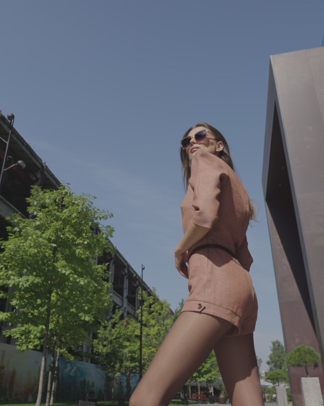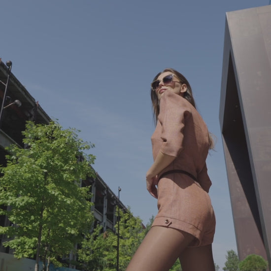 This tailored playsuit is crafted from a breathable wool-linen blend that balances natural warmth with soft structure. The fitted bodice features a button-front closure and bust darts for subtle shaping, while a structured waist panel defines the silhouette with clean precision. Tailored three-quarter sleeves and contoured shoulders add a refined finish.